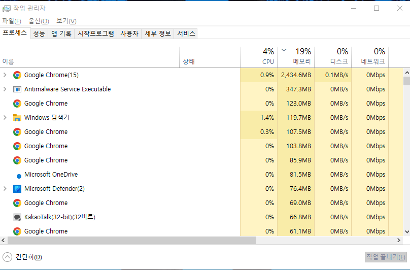 Ctrl + Shift + Esc 를 누릅니다.