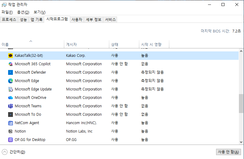 방법 1. 작업관리자로 시작프로그램 정리하기 (가장 쉬운 방법)