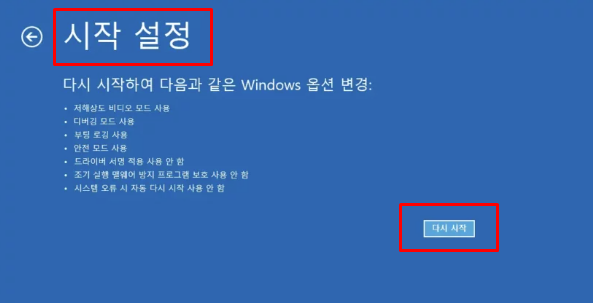- 고급 시작 옵션 → 지금 다시 시작